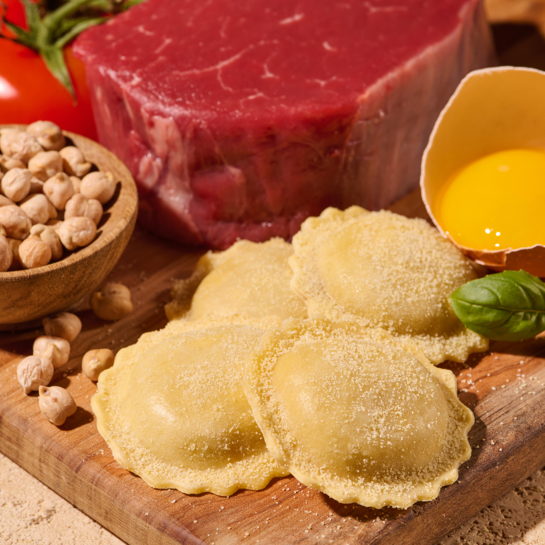 Wir sind die Ersten, die klassische italienische Pasta und Lasagne in echte High-Protein-Gerichte verwandelt haben – mit Kichererbsenmehl im Teig und raffiniert abgeschmeckten Füllungen. Ob unsere Ravioli mit herzhafter Fleischfüllung oder die Lasagne mit hellem Ragù aus Hähnchen und Pute: Hier trifft authentischer Geschmack auf ausgewogene Nährwerte.