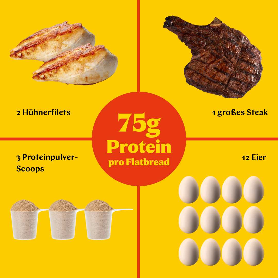 Unsere High-Protein-Pizzen sind darauf ausgelegt, Dir eine bedeutende Nährstoffversorgung zu bieten, ohne dabei auf den Geschmack zu verzichten. Im Vergleich zu üblichen Nahrungsoptionen wie Steak, Hühnerfilets, Eiern und Proteinpulver-Scoops bieten unsere Pizzen bis zu 76 g Protein pro Portion. Das macht sie zu einer hervorragenden Wahl für Muskelaufbau, Fitness-Erhaltung oder zur Unterstützung Deiner Workout-Routine.