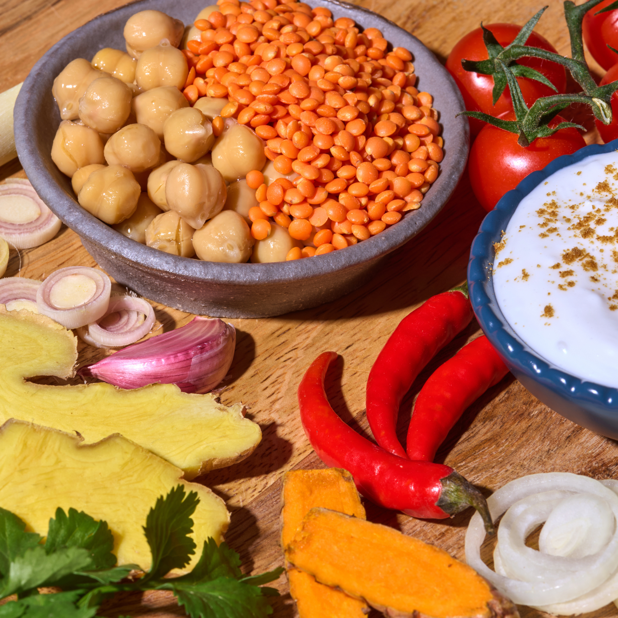Kichererbsen und Linsen in einer cremigen Tomaten-Kokos-Sauce mit feinem Ingwer und Zitronengras. Mild gewürzt, warm und voller Tiefe. Passt zu Reis, Naan oder Gemüse und bringt dabei pflanzliches Protein und reichlich Ballaststoffe auf den Teller.