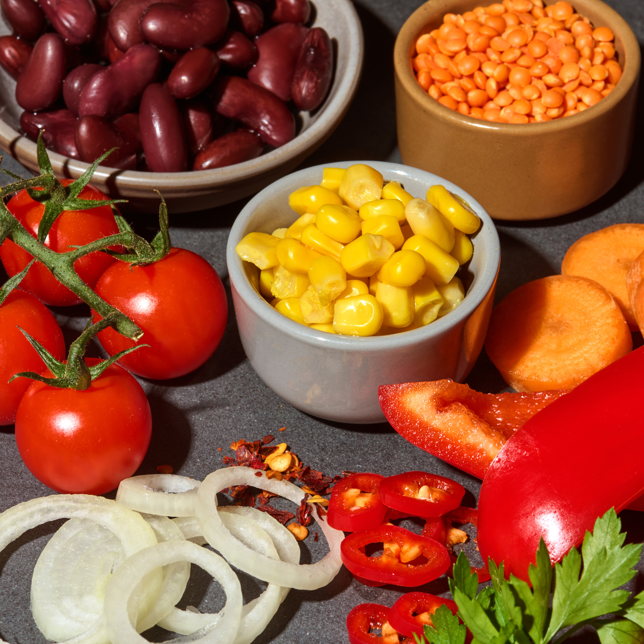Ein warm würziges Chili mit Tomate, Bohnen, Linsen, Mais, Karotte und Paprika, abgeschmeckt mit Gewürzen, die an mexikanische Klassiker erinnern. Aromatisch und leicht pikant, mit einer pflanzlichen Basis, die natürliches Protein und wertvolle Ballaststoffe liefert.