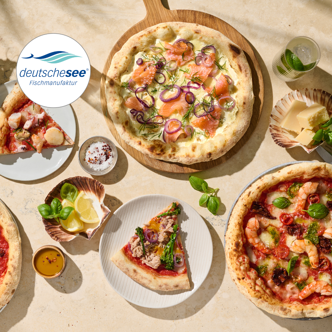 Gemeinsam mit der Deutsche See Fischmanufaktur haben wir zwei besondere Pizzen kreiert: Gambas Supreme und Seafood Deluxe – eine Partnerschaft, die für höchste Qualität und verantwortungsvollen Genuss steht. In unserer Manufaktur backen wir die Pizzen mit viel handwerklichem Können und belegen sie mit den erstklassigen Meeresfrüchten von Deutsche See. Seit Jahrzehnten steht Deutsche See für Premium-Qualität, nachhaltigen Fischfang und schonende Verarbeitung – und ergänzt damit perfekt unseren Anspruch an Frische, Qualität und echtes Handwerk.