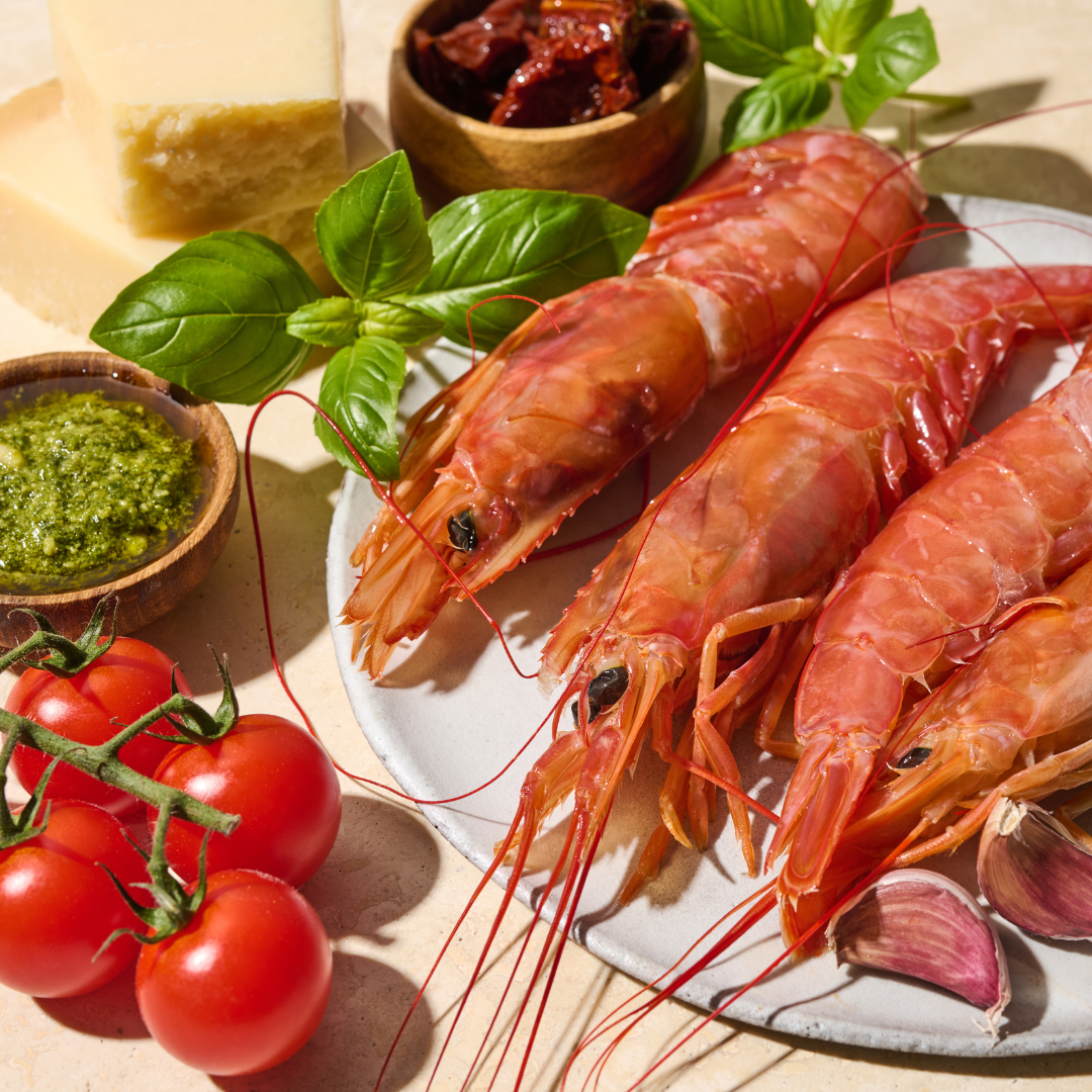 Saftige Garnelen, Fior di Latte Mozzarella und sonnengereifte Tomaten, verfeinert mit Knoblauch, Basilikum, Pinienkernen und getrockneten Cherrytomaten. Diese Pizza vereint mediterrane Meeresküche und high protein Genuss auf knusprigem Boden mit 53 g Protein pro Pizza.