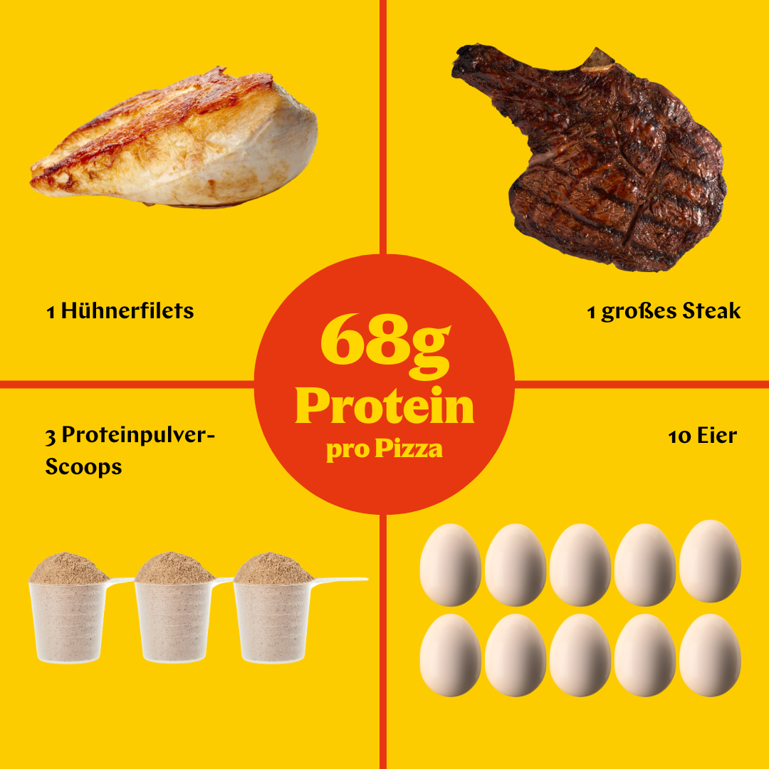 Unsere High-Protein-Pizzen versorgen Dich mit wertvollen Nährstoffen – ohne Kompromisse beim Geschmack. Im Vergleich zu klassischen Proteinquellen wie Steak, Hühnerfilet, Eiern oder Proteinpulver liefern unsere Pizzen echte Werte: 60 g Protein in der Margherita, 60 g in der Thunfisch-Pizza und 68 g in der Hähnchen-Pizza. Damit sind sie die perfekte Wahl für Muskelaufbau, Fitness oder zur Unterstützung Deiner Trainingsroutine.